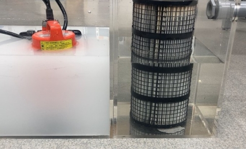 フィルテックスは面倒な作業を削減する設計もされています。まず、電源ケーブルを100Vコンセントに差し込めば運転準備完了です。タンクは全て透明なのでフタを開けて覗き込まなくても一目でタンク内の状況が解ります。フィルタが詰まると排水タンクの水位が上がりブザーが鳴ります。ブザーが鳴ったらフィルタ交換の合図です。フィルターはタンクに入っているだけなのでワンタッチ継手のホースを外してフィルタを交換して終わりです。面倒な水抜きやハウジングを外すなどの作業は一切必要ありません。